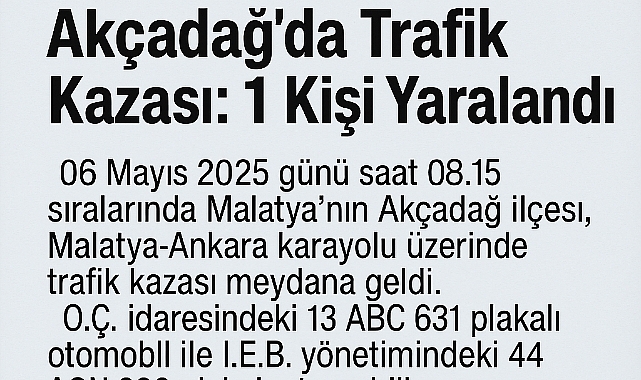 O.Ç. idaresindeki 13 ABC 631 plakalı otomobil ile İ.E.B. yönetimindeki 44 AGN 226 plakalı otomobilin çarpışması sonucu yaralanmalı ve maddi hasarlı bir kaza oluştu. Kazada, 44 AGN 226 plakalı araçta yolcu olarak bulunan E.B. isimli şahıs yaralandı. Yaralının hayati tehlikesinin bulunmadığı öğrenildi.