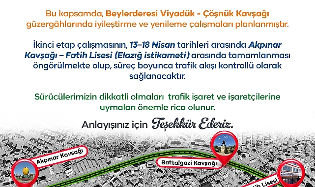İlk etap çalışmaların ardından ikinci etap çalışmalarının, 13–18 Nisan tarihleri arasında Akpınar Kavşağı – Fatih Lisesi (Elazığ istikameti) arasında tamamlanması öngörülmekte olup, süreç boyunca trafik akışı kontrollü olarak sağlanacaktır.