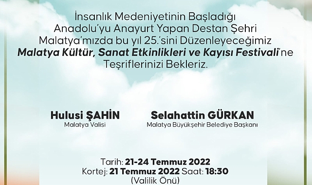 Kültür ve Turizm Bakanlığı, Malatya Valiliği ve Malatya Büyükşehir Belediyesi tarafından 21-24 Temmuz tarihleri arasında 25’incisi düzenlenecek olan Uluslararası Kültür Sanat Etkinlikleri ve Kayısı Festivali hazırlıkları tamamlandı.Birçok farklı etkinliğin düzenleneceği Kayısı Festivali 21 Temmuz Perşembe günü Valilik önünden başlayıp Büyükşehir Belediyesi önünde sona erecek olan kortej yürüyüşü ile start alacak.21-24 Temmuz tarihleri arasında gerçekleştirilecek olan Kayısı Festivali programları:21 Temmuz Perşembe Günü:En İyi Yaş Kayısı Yarışması Yer: Mişmiş Park Fuar Merkezi/ Saat: 10:00Tarihsel Süreçte Kayısı Paneli Yer: Mişmiş Park Fuar Merkezi/ Saat: 11:00Cuma-Cumartesi-Pazar Sergisi Yer: Taşhoron Kültür ve Sanat Merkezi/Saat: 14:00KORTEJ YÜRÜYÜŞÜYer: Kapalı Çarşı önünden başlayıp, Büyükşehir Belediyesi yanında son bulacaktır. Saat: 18:30KONSERSena ALTUNTOP –Ahmet UÇAR – Batuhan GÖKBULUT Yer: Büyükşehir Belediyesi Yanı / Saat: 19:30KERNEK ÖDÜLLERİ Yer: Büyükşehir Belediyesi Yanı / Saat: 20:15KAYISI YARIŞMASI ÖDÜL TÖRENİ Yer: Büyükşehir Belediyesi Yanı / Saat: 20:30KONSERUĞUR ASLAN - BURAY Yer: Büyükşehir Belediyesi Yanı / Saat: 20:45HAVAİ FİŞEK GÖSTERİSİ Yer: Büyükşehir Belediyesi Yanı / Saat: 00:00 22 Temmuz Cuma Günü:Malatya’da Dört Mevsim Fotoğraf Sergisi Yer: Doğa Cadde A.V.M / Saat: 11:00Kadınlara Yönelik (Orlon Çilesi – Düğme Dikme – İpliğe Boncuk Dizme Yarışmaları) Çocuklara Yönelik (Çuval Yarışı- Yumurta Yarışı) Yer: Kernek Meydanı / Saat: 15:00YABANCI HALK OYUNLARI (AZERBEYCAN) Yer: Eski Belediye Meydanı/ Saat: 17:00YABANCI HALK OYUNLARI (TACİKİSTAN) Yer: Millet Bahçesi/ Saat: 18:30KONSERMustafa KISACIK – Muharrem İMİK Eymen KULCU Yer: Mişmiş Park Fuar Alanı/Saat: 19:30‘Bir Umut Öyküsünde Tatlı Telaş’ Hikaye Yarışması Ödül Töreni Yer: Mişmiş Park Fuar Alanı/Saat: 20:15KONSER Özlem BÜYÜK-Haluk LEVENT Yer: Mişmiş Park Fuar Alanı/Saat: 20:3023 Temmuz Cumartesi Günü:Kayısının Serüveni Fotoğraf Sergisi Yer: Malatya Park A.V.M / Saat: 11:00Atlı Cirit Müsabakaları Yer: Nikah Sarayı Arkası/ Saat: 16:00‘ENGELSİZ SAHNE’ KONSERİ Yer: Kernek Meydanı/ Saat: 17:00YABANCI HALK OYUNLARI (GÜRCİSTAN) Yer: Kernek Meydanı/ Saat: 18:30YABANCI HALK OYUNLARI (KIRGIZİSTAN) Yer: Sanat Sokağı/ Saat: 19:30KONSER Burak AKADEMİR – Sadi KARAKAŞ Yer: Mişmiş Park Fuar Alanı/Saat: 19:30KONSER Mehmet BALABAN Yer: Mişmiş Park Fuar Alanı/ Saat: 20:30KONSER Hande YENER Yer: Mişmiş Park Fuar Alanı/ Saat: 22:0024 Temmuz Pazar Günü:El Emeği Sergisi (Kadın Kursiyerler Tarafından Yapılan Ürünler)-Spor Şenliği (Mini Voleybol, Penaltı Cup, 3x3 Basketbol, Ayak Tenisi, Atletizm, Tekvando, Kick Boks, Bocce, Dart, Masa Tenisi, Bisiklet Yarışı, Karakucak Güreş, Badminton, Muay Tai, Badminton, Wushu)Yer: Millet Bahçesi / Saat: 10:00 – 20:00YABANCI HALK OYUNLARI (RUS-KAFKAS) Yer: Hürriyet Parkı/ Saat: 14:30BOYAMA ETKİNLİĞİ – Tişört Boyama Etkinliği Yer: Hürriyet Parkı / Saat: 15:00YABANCI HALK OYUNLARI (KUZEY OSETYA) Yer: Malatya Park AVM Önü/ Saat: 16:00KONSER Mahmut ATABAY – Orçun AKGÜN Yer: Mişmiş Park Fuar Alanı / Saat: 19:30 KONSER EYPİO ve Serdar ORTAÇ Yer: Mişmiş Park Fuar Alanı / Saat: 21:00