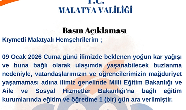 Bu kapsamda; Malatya ili genelinde, Milli Eğitim Bakanlığı ile Aile ve Sosyal Hizmetler Bakanlığı’na bağlı tüm eğitim kurumlarında eğitim ve öğretime 1 (bir) gün süreyle ara verilmiştir.