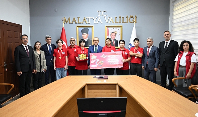 Kuzey Kıbrıs Türk Cumhuriyeti’nde (KKTC) düzenlenen 2025 TEKNOFEST yarışmasında büyük bir başarıya imza atarak birinci olan Malatya Battalgazi Dr. Saadettin Hacıevliyagil İmam Hatip Ortaokulu Fen Bilimleri öğretmeni Hakan Becer danışmanlığında yarışmaya katılan öğrenciler; Malatya Erman Ilıcak Fen Lisesinden Arda Tahsin Ürün ve Egemen Çetmen, Malatya Lisesinden Fatih Polat ve Elanur Özçelik ile Selahattin Eyyubi Anadolu İmam Hatip Lisesinden Halit Karaca'dan oluşan ekip Vali Seddar Yavuz’u makamında ziyaret etti.Yarışmada geliştirdikleri yenilikçi teknoloji projeleriyle hem jüriyi hem de izleyicileri etkileyen başarılı gençler, kazandıkları ödülün ardından Malatya ‘yı gururlandırdı. Vali Yavuz, gençleri ve onları yetiştiren öğretmenleri tebrik ederek başarılarının devamını diledi.Ziyaret sırasında öğrenciler projelerini Vali Yavuz’a tanıtarak süreç hakkında bilgi verdi. Gençlerin vizyonu ve üretkenliği karşısında duyduğu memnuniyeti dile getiren Vali Yavuz, “Sizler ülkemizin yarınlarısınız. Böyle azimli ve başarılı gençleri görmek bizleri umutlandırıyor. Her zaman yanınızdayız,” dedi.Ziyaret, hatıra fotoğrafı çekimi ve hediye takdimi ile sona erdi.